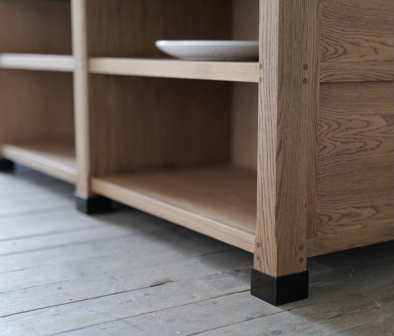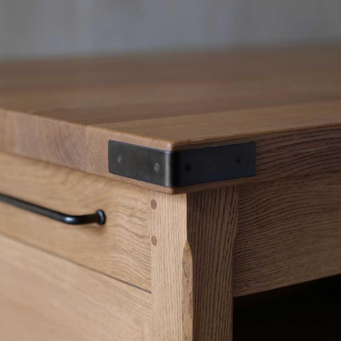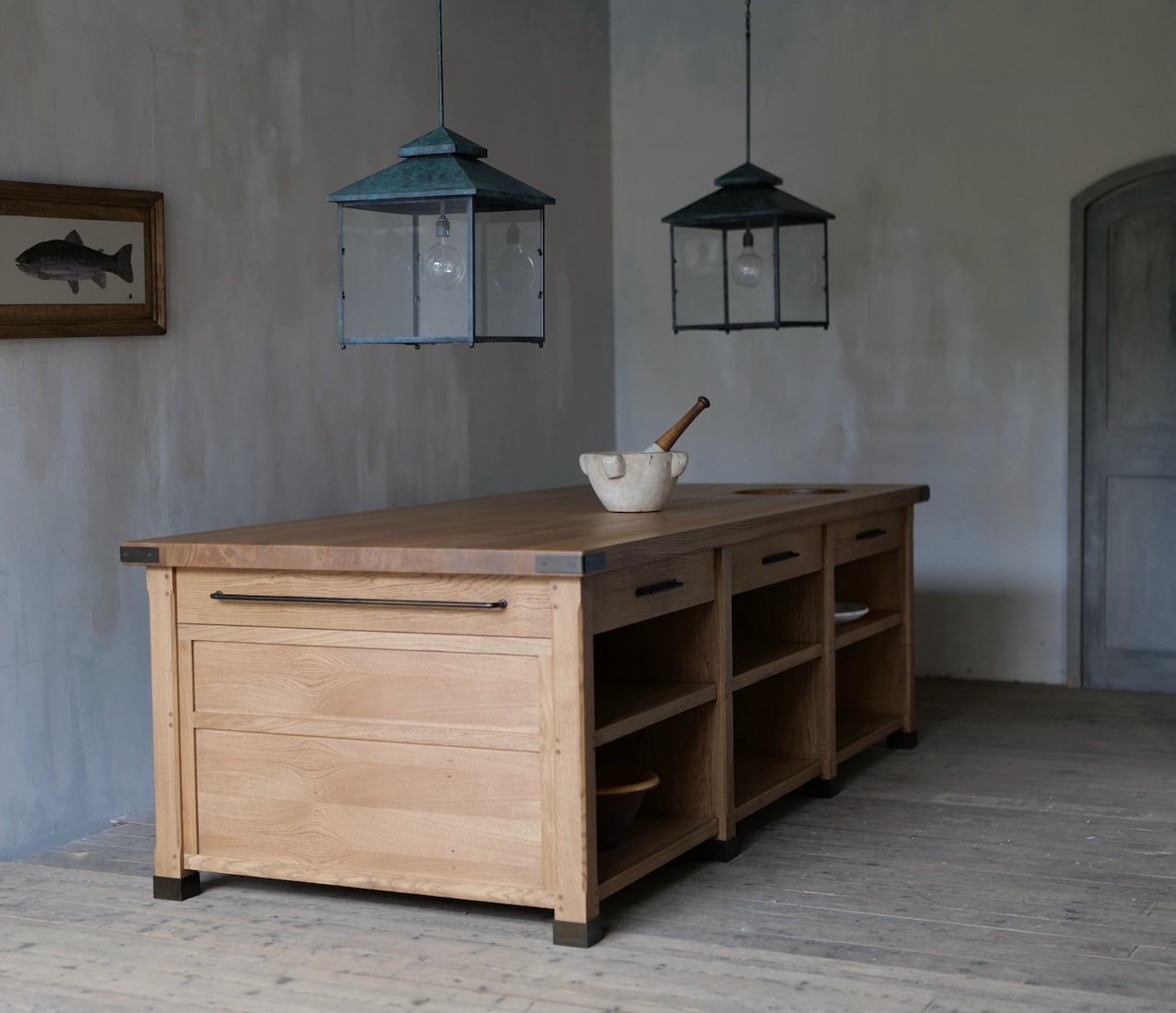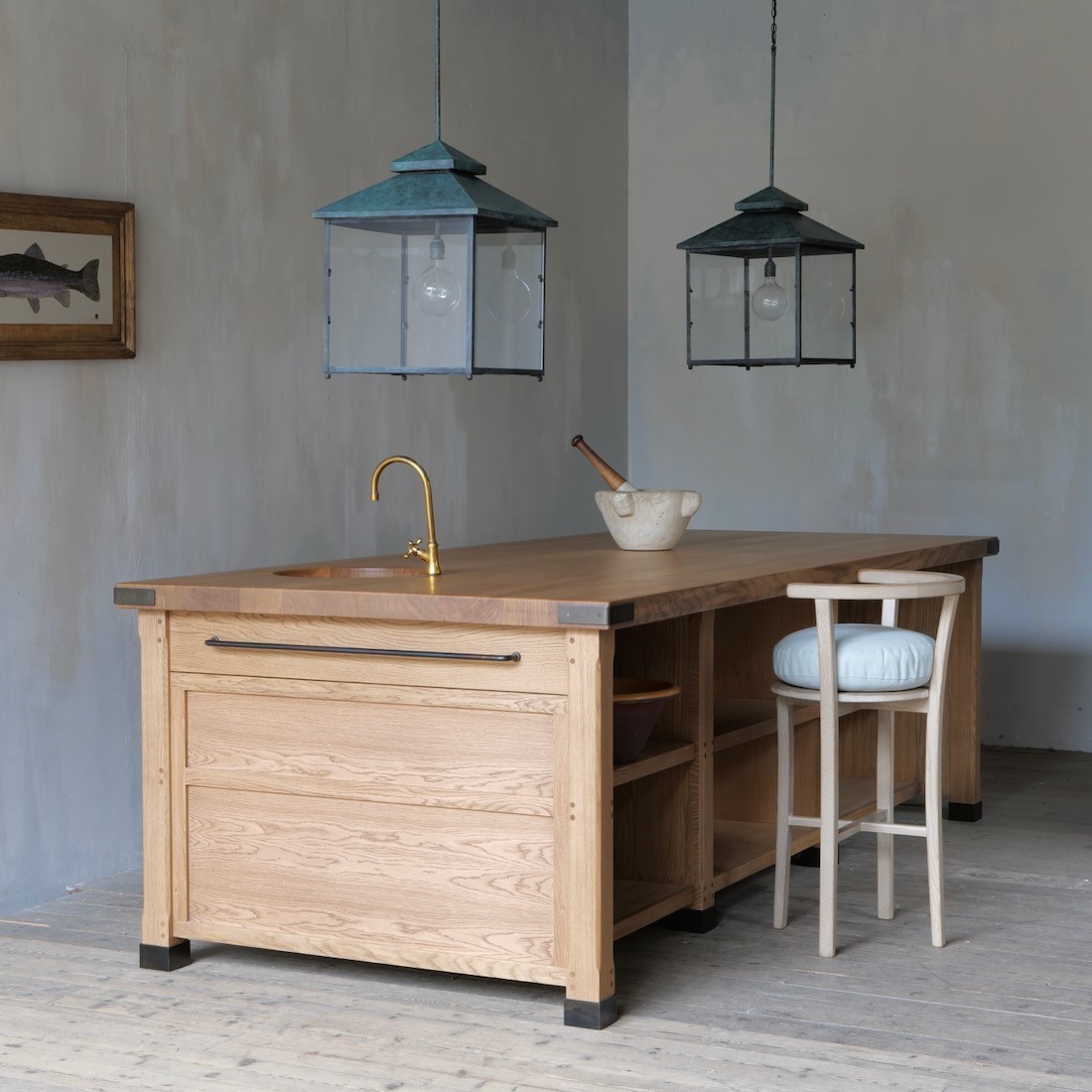 The steel corner brackets and foot covers were suggested by our client, and play into the overall feel of a robust and hard working island, remeniscent of a period preparation table.