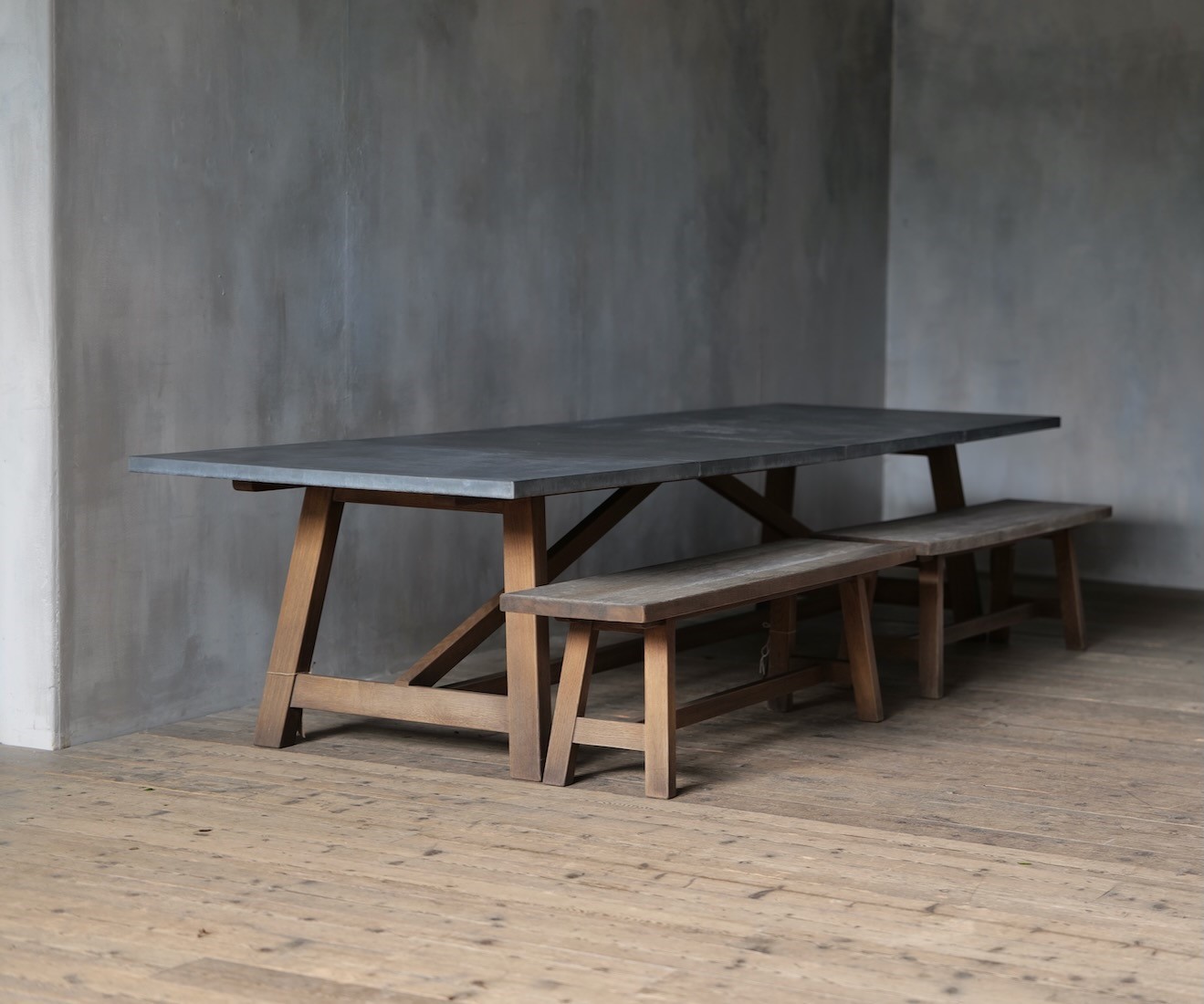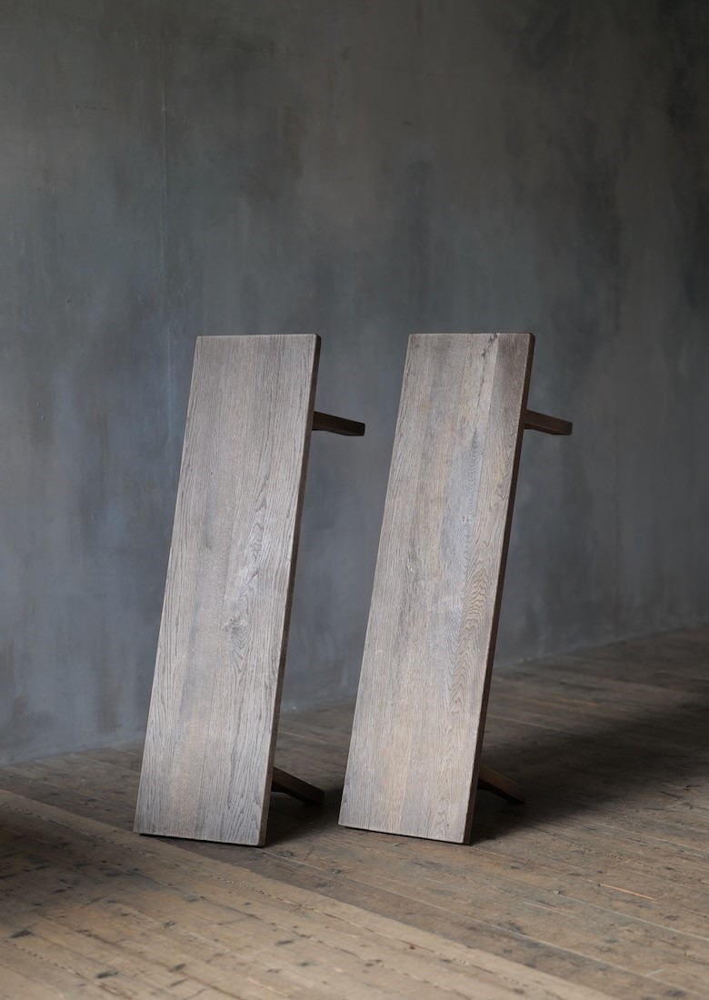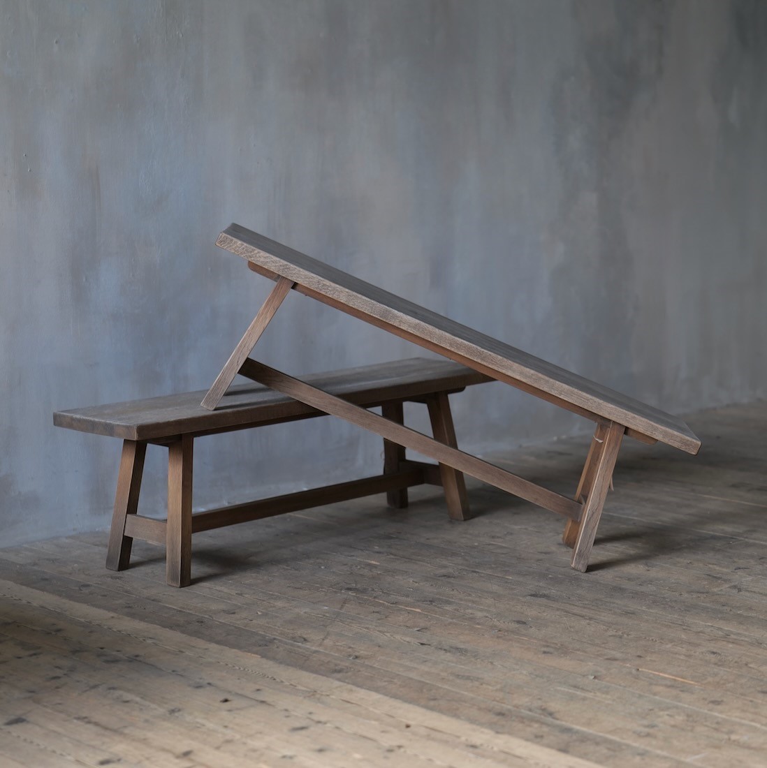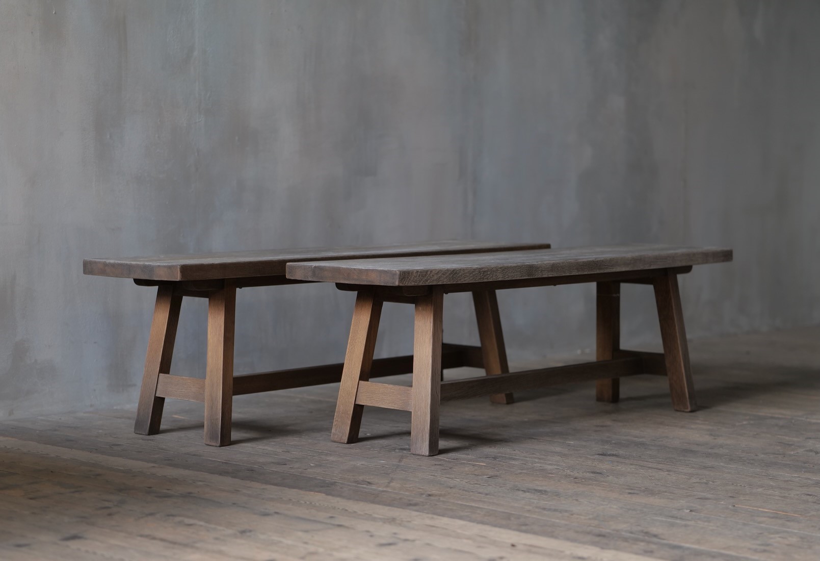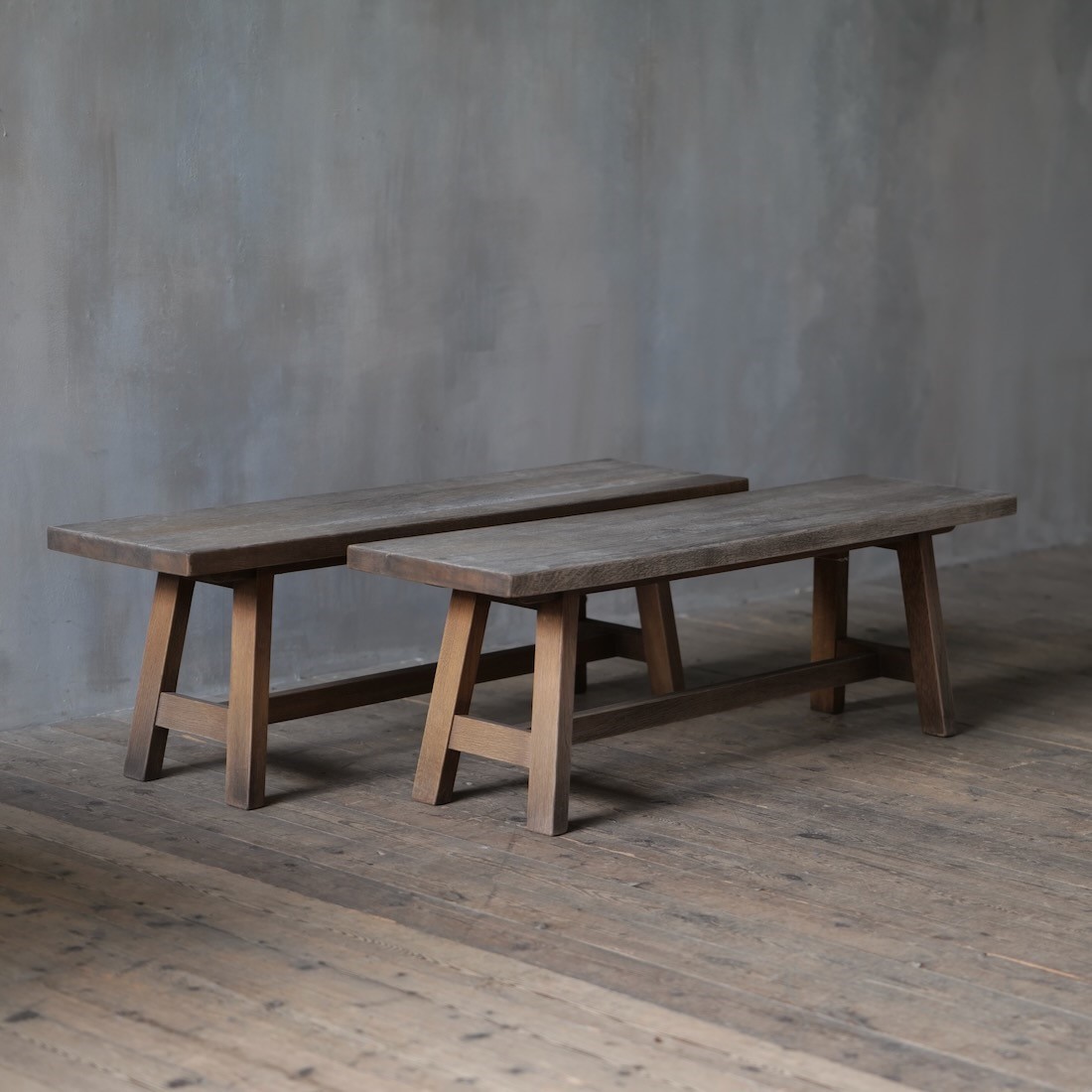 A pair of Matthew Cox oak orangery benches with beautifully weathered surfaces. Made in prime FSC oak.